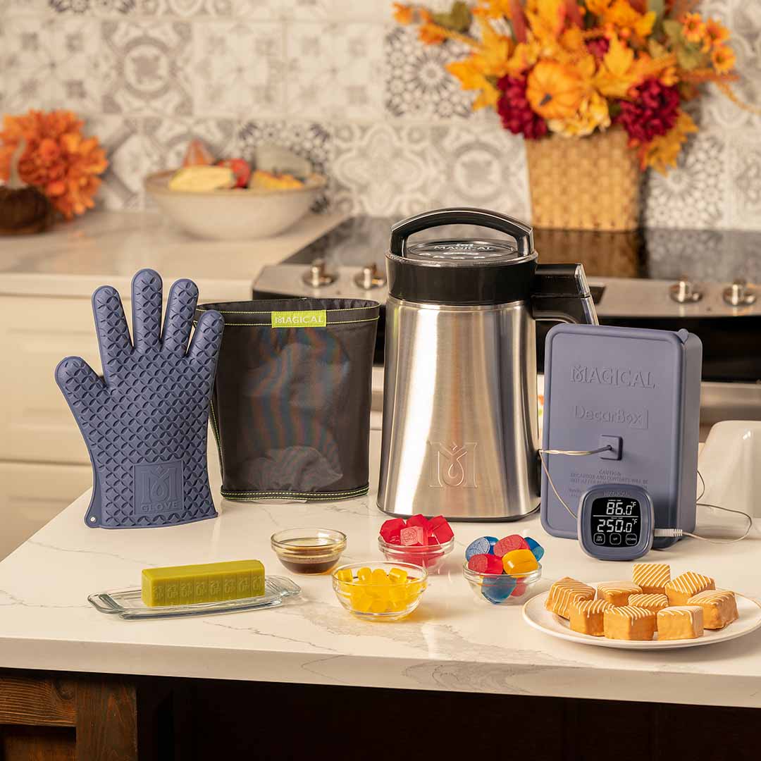 The Decarb Bundle is perfect to precisely activate your herbs in the DecarBox and easily infuse herbal butter, oils, or tinctures in the MagicalButter Machine. An immersion blender with a programmable thermostat and heating unit, the MagicalButter MB2e machine grinds, heats, stirs and steeps your herbal extract, all at the correct time intervals and temperature for a complete cycle every time. The DecarBox comes with an integrated digital thermometer that lets you easily calibrate your oven for precise accuracy while you decarboxylate. The external digital display lets you monitor the temperature inside your DecarBox™ during decarboxylation without opening the oven, keeping temperatures from fluctuating. Making the DecarBox one of the most effective decarboxylation systems available. Each Decarb Bundle purchase will come with our handy Magical Cookbook, a 190 micron Purify Filter for straining, and our Magical Glove silicone oven mitt.